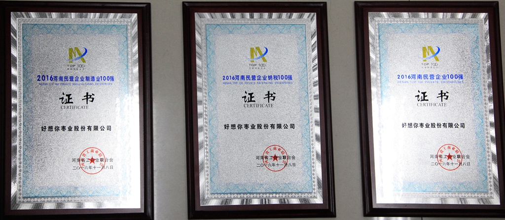 11月8日,省工商聯正式發布2016河南民營企業100強榜單,好想你棗業以11.13億元的年度營業收入、8176萬元的年度納稅總額,位居2016河南民營企業百強榜第92位、河南民營企業制造業百強榜單第62位、河南民營企業納稅百強榜單第53位。