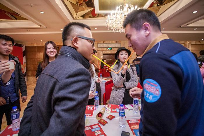 簡單的熱場之后,又是好玩的“傳遞吸管”游戲,現場的男女嘉賓被分成5隊,每隊各20位男生、20位女生,每位嘉賓都領到一根吸管,將吸管咬在嘴里,從最邊上的嘉賓開始依次傳遞一根彩色皮筋。為了吸引心儀異性的注意,游戲過程中,每位嘉賓都使出了渾身解數。